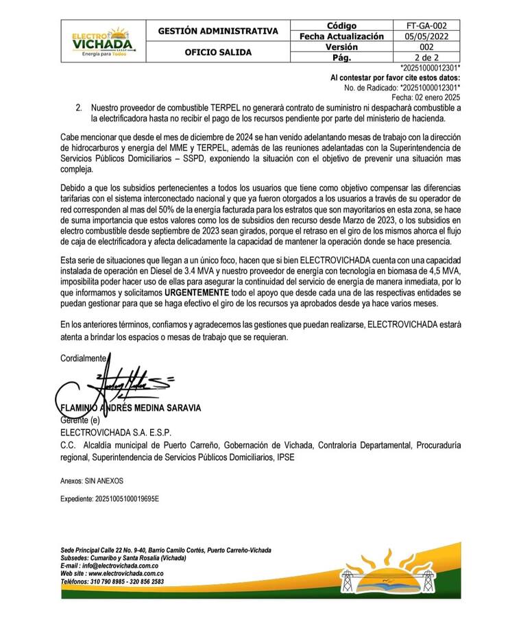 En la misma carta, Electrovichada expresó su preocupación señalando que “la demora en el giro de los recursos por parte del Ministerio de Minas afecta delicadamente la capacidad de mantener la operación donde se hace presencia”. A pesar de que se han realizado mesas de trabajo desde diciembre de 2024 entre el Ministerio, la Superintendencia de Servicios Públicos y otras entidades, no se ha llegado a una solución efectiva.