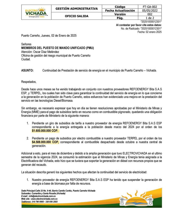 Puerto Carreño, Vichada, enfrenta una severa crisis energética desde la tarde del 2 de enero, resultado de las millonarias deudas del Gobierno Nacional a proveedores de energía. Según información revelada por Electrovichada, la empresa encargada del suministro eléctrico en la región, el Ministerio de Minas y Energía debe $1.600 millones de pesos colombianos a Refoenergy, proveedor de energía, correspondientes a subsidios de tarifa por la energía suministrada desde marzo de 2024.