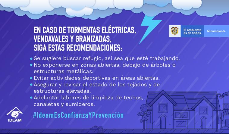 De acuerdo con el Instituto de Hidrología, Meteorología y Estudios Ambientales (Ideam), estas son las recomendaciones que debe seguir en caso de tormentas eléctricas, vendavales y granizadas, sobre todo para tener en cuenta durante temporada de lluvias: