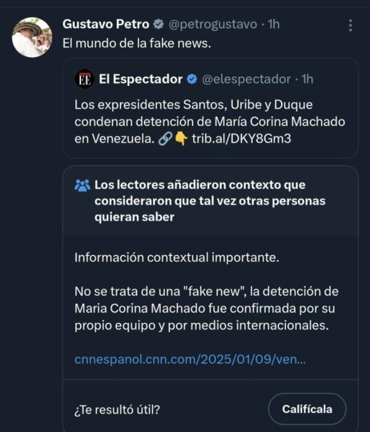 El presidente Petro aseguró que tal detención no se realizó y que esto había sido un “fake new”, es decir, una noticia falsa. Pero, ante esto la red social X emitió una alerta: “Los lectores añadieron contexto que consideraron que tal vez otras personas quieran saber”.