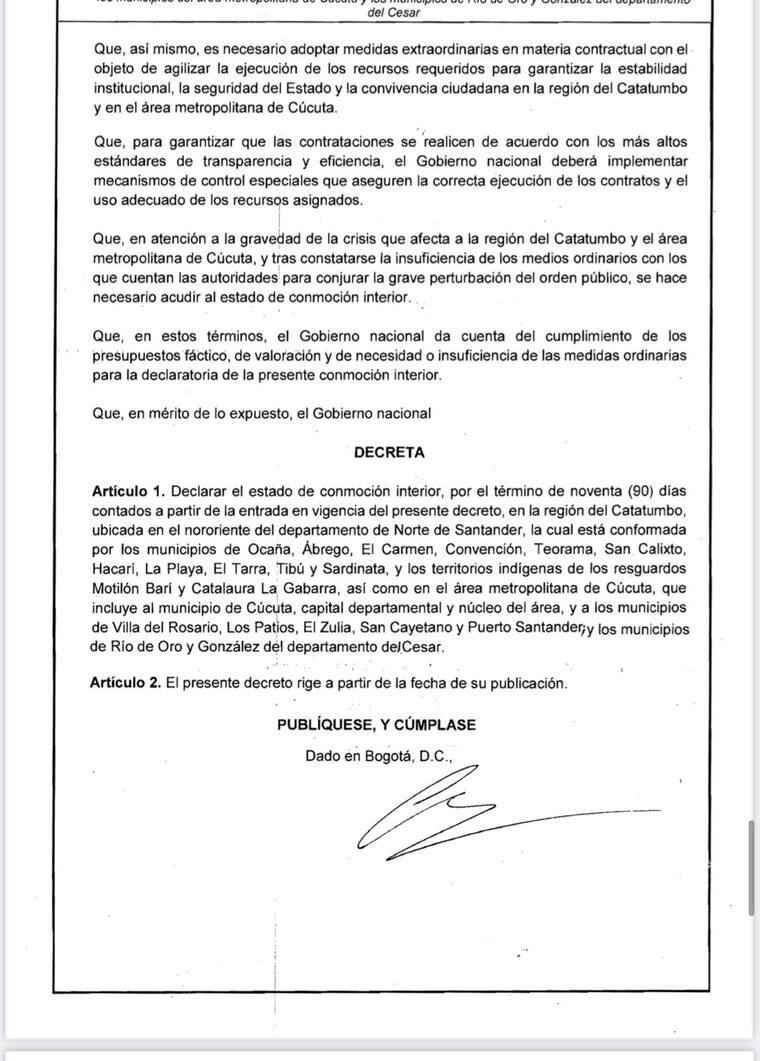 En la mañana de este viernes 24 de enero, el Gobierno nacional expidió el Decreto 0062 con el que se declara conmoción interior en todos los municipios de la región del Catatumbo, los del área metropolitana de Cúcuta y dos municipios del Cesar: Río de Oro y González.
