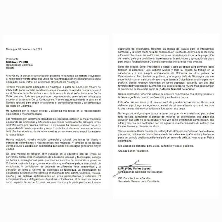 León Fredy Muñoz ha hecho oficial su renuncia como embajador de Colombia en Nicaragua. Este viernes, 31 de enero, el diplomático envió su carta de dimisión al presidente Gustavo Petro, confirmando su intención de ocupar una curul en el Senado de la República que quedó vacante tras la renuncia de Humberto de la Calle.