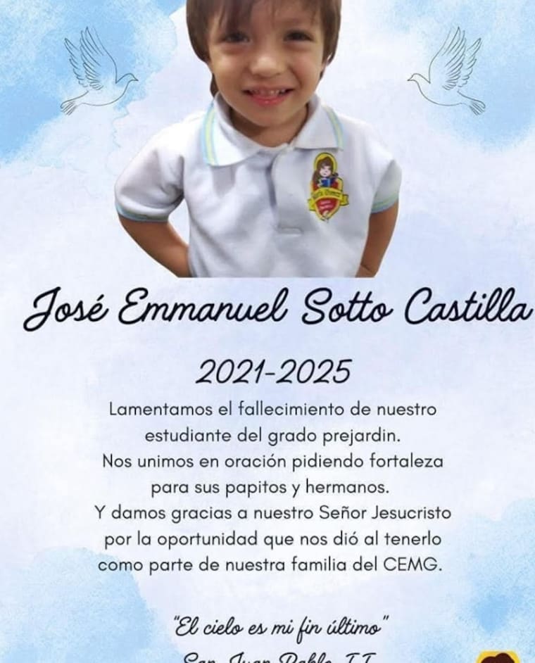 El pequeño José Emmanuel Sotto Castilla, de tres años, murió ahogado en una piscina mientras nadaba en el municipio Cocorná, Antioquia.