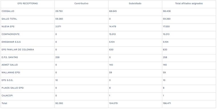 El proceso de traslado de usuarios incluye a 196.471 afiliados de Compensar EPS, y 1.814 afiliados de la Coosalud, EPS que fue intervenida el pasado 22 de noviembre.