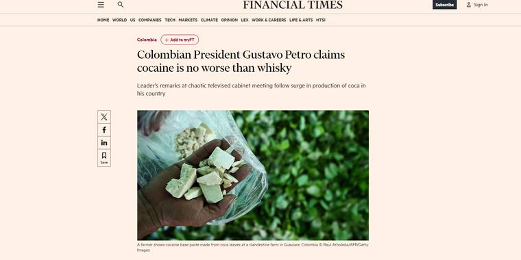 “Petro, un ex miembro del grupo guerrillero izquierdista que anteriormente calificó de fracaso la guerra contra las drogas liderada por Estados Unidos, dijo durante una reunión televisada del gabinete que la cocaína -de la que Colombia es por lejos el mayor productor- sólo era ilegal ‘porque se fabrica en América Latina’”, se lee en el artículo del diario.