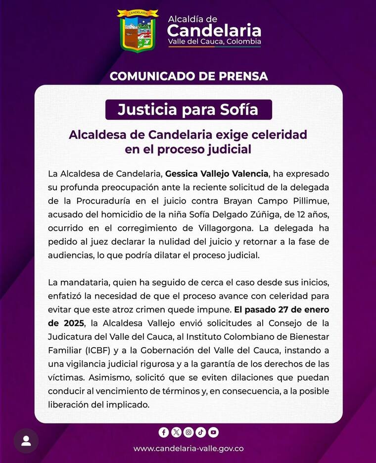 La alcaldesa de Candelaria, Gessica Vallejo Valencia, hizo un llamado enérgico a la justicia para que actúe con celeridad. A través de un comunicado, expresó su preocupación por las constantes dilaciones y reafirmó su compromiso con los familiares de la menor.