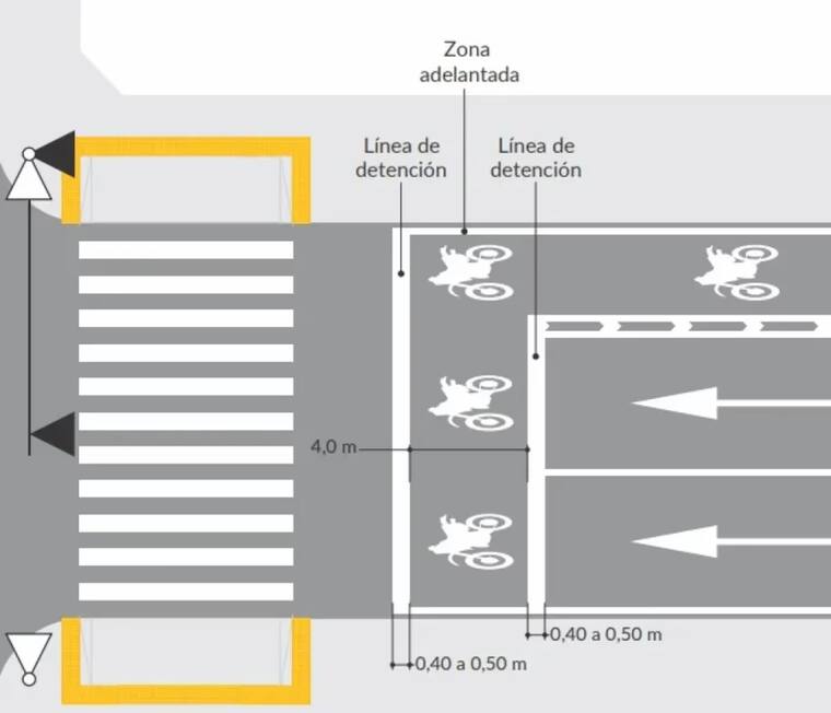 En cuanto a las zonas de espera adelantada para motocicletas en intersecciones semaforizadas, permitirán que los motociclistas se ubiquen frente al resto de los vehículos mientras esperan el cambio de luz del semáforo.