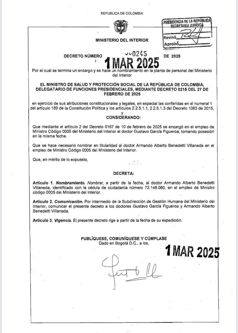 La designación de Benedetti quedó formalizada mediante el Decreto 0245 del 1 de marzo de 2025, en el cual se establece que “a partir de la fecha, el doctor Armando Alberto Benedetti Villaneda asumirá el empleo de Ministro código 0005 del Ministerio del Interior”. Asimismo, el documento instruye a la Subdirección de Gestión Humana del Ministerio del Interior para comunicar la decisión a los interesados.