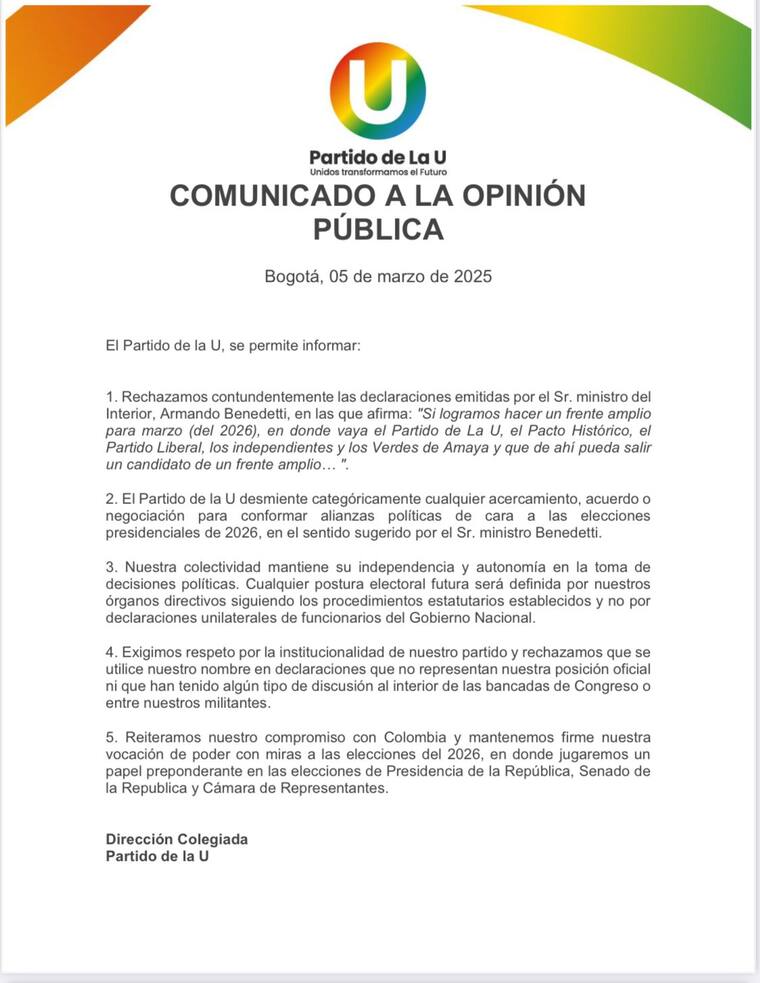 “El Partido de la U desmiente categóricamente cualquier acercamiento, acuerdo o negociación para conformar alianzas políticas de cara a las elecciones presidenciales de 2026, en el sentido sugerido por el Sr. ministro Benedetti”, se lee en el documento.