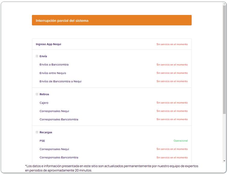 Incluso, en la página oficial, Nequi tiene la posibilidad de verificar el estado actual de sus servicios. En este se puede observar que casi todos están “sin servicio”. Solo se mantiene activo el servicio el pago por PSE.
