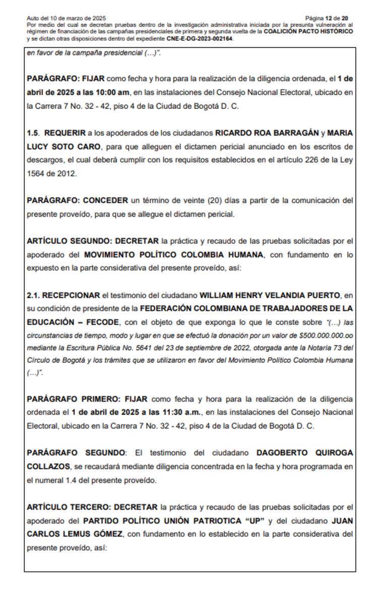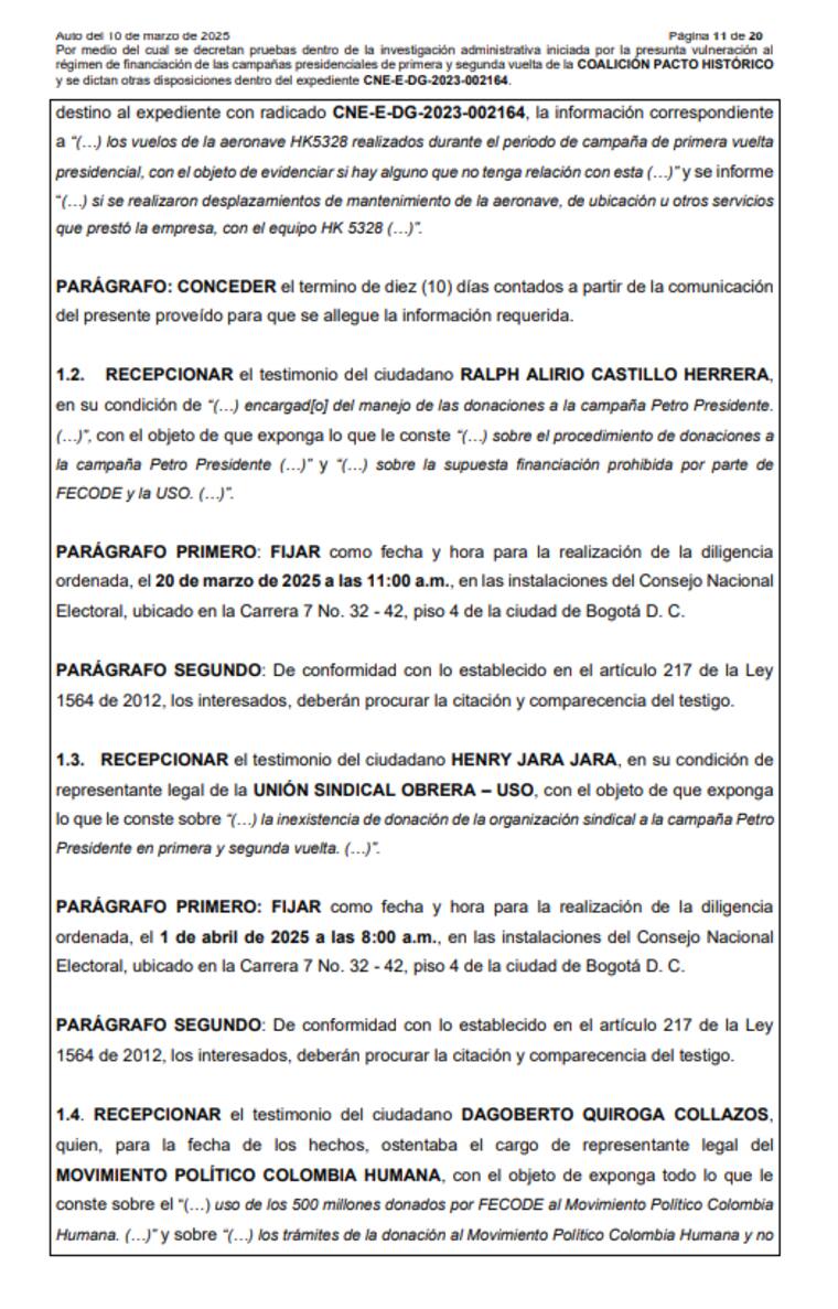 En el documento se conoció que el CNE recepcionará el testimonio de Ralph Alirio Castillo, encargado del manejo de las donaciones de la campaña presidencial de Petro “con el objeto de que exponga lo que le conste sobre el procedimiento de donaciones a la contienda y sobre la supuesta financiación prohibida por parte de Fecode y la Unión Sindical Obrera (USO)”.