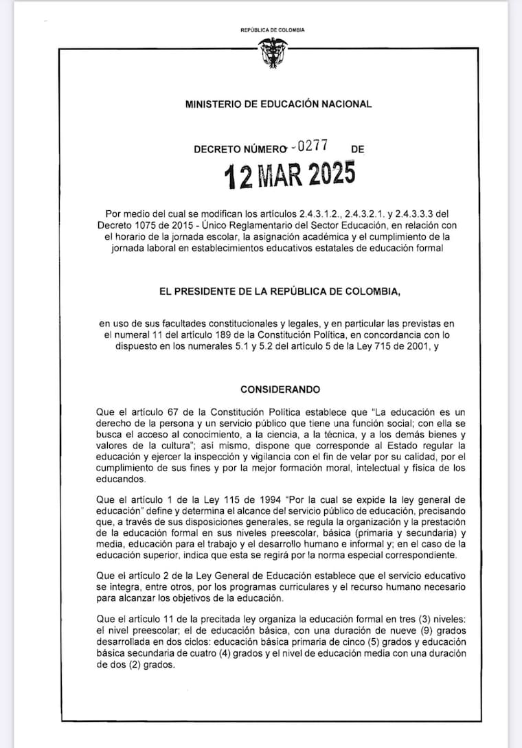 Un ajuste en el horario de la jornada escolar, la asignación académica y el cumplimiento de la jornada laboral en los establecimientos educativos estatales establece el Decreto 0277 expedido por el Gobierno 12 de marzo de 2025.