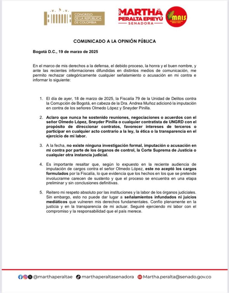 En un comunicado del pasado 19 de marzo, Peralta había señalado en un comunicado: “Aclaro que nunca he sostenido reuniones, negociaciones o acuerdos con el señor Olmedo López, Sneyder Pinilla o cualquier contratista de UNGRD con el propósito de direccionar contratos, favorecer intereses de terceros o participar en cualquier acto contrario a la ley, la ética o la transparencia en el ejercicio de mi labor”.