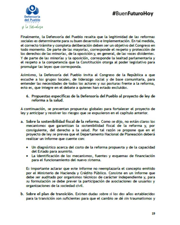 “Sobre la sostenibilidad fiscal de la reforma. Como se dijo, no están claros los mecanismos que garantizan la sostenibilidad fiscal de la reforma y, por consiguiente, del derecho a la salud”, se lee.