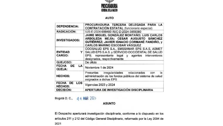 El auto, de 23 páginas, publicado por la Procuraduría especifica que: “Ordenar apertura de investigación disciplinaria contra Jaime Miguel González Montaño, representante legal principal de COOSALUD EPS S.A.S.; Luis Carlos Arboleda Mejía, agente interventor de EMSSANAR S.A.S. EPS; Cesar Augusto Sánchez Gutiérrez, agente interventor de EMSSANAR S.A.S. EPS; Javier Ignacio Cormané Fandiño, agente interventor de ASMET SALUD EPS S.A.S; y Carlos Marino Escobar Vásquez, agente interventor de SERVICIO OCCIDENTAL DE SALUD EPS; para la época de los hechos, por las razones expuestas en la parte motiva de esta providencia”.