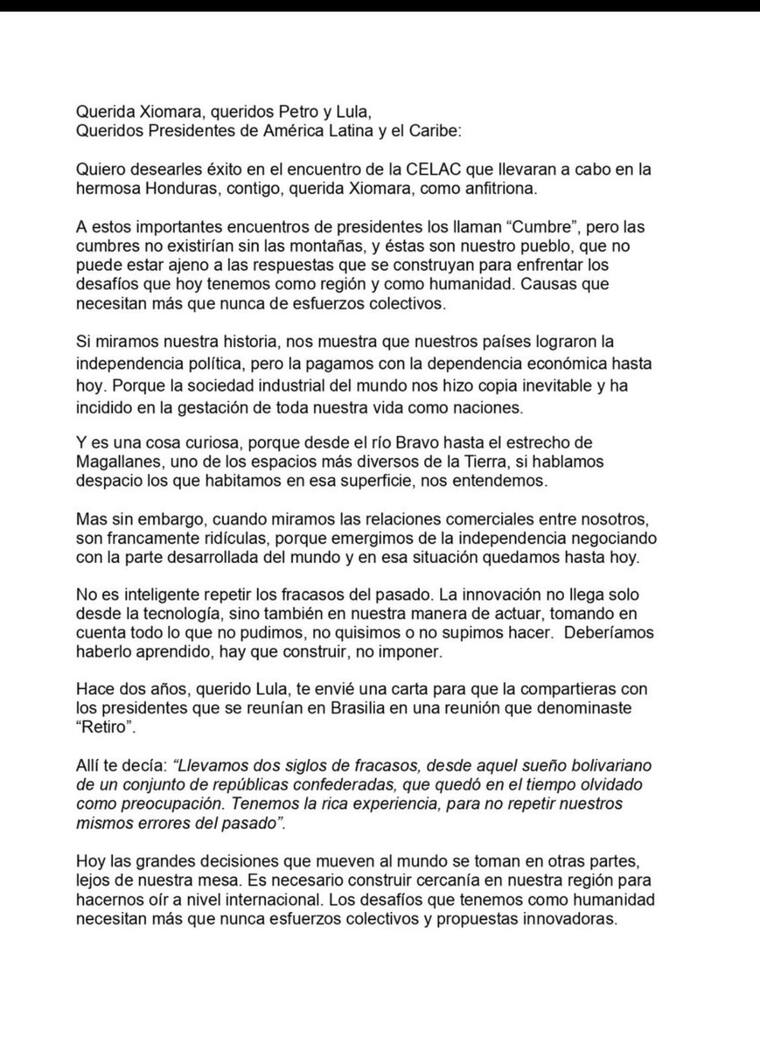 En el marco de la cumbre de la Comunidad de Estados Latinoamericanos y Caribeños (Celac) celebrada en Tegucigalpa, el expresidente uruguayo José “Pepe” Mujica ha dirigido una emotiva carta a los mandatarios de Honduras, Xiomara Castro; Brasil, Luiz Inácio Lula da Silva; y al presidente Gustavo Petro, quien asume la presidencia del organismo por el próximo año.