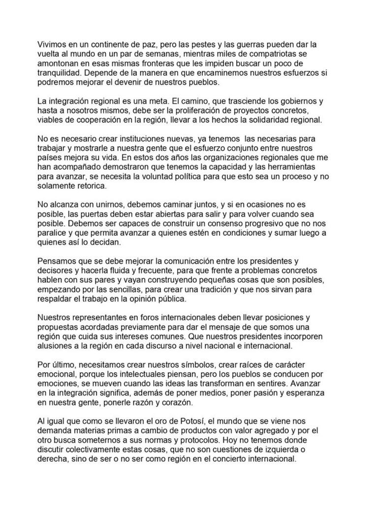 En su mensaje, Mujica hace un llamado urgente a fortalecer la integración regional para que América Latina pueda tener voz en el escenario internacional. “Hoy las grandes decisiones que mueven al mundo se toman en otras partes, lejos de nuestra mesa. Es necesario construir cercanía en nuestra región para hacernos oír a nivel internacional”, señaló el exmandatario uruguayo.