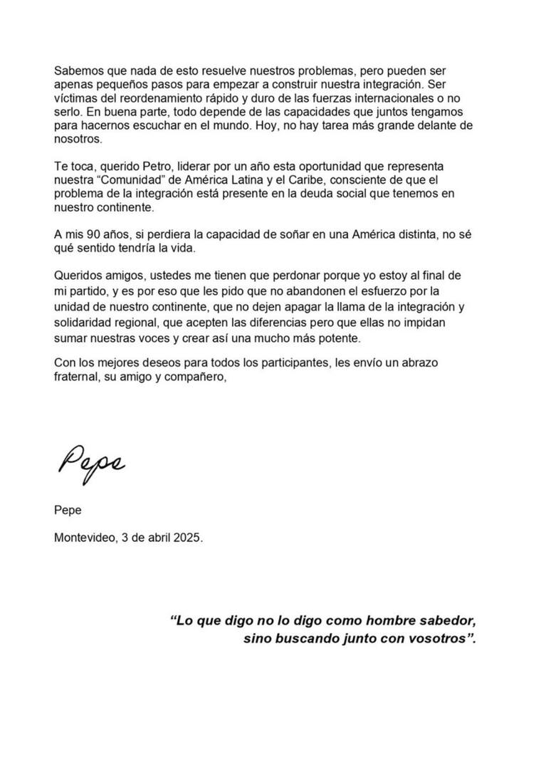 En su carta, Mujica enfatizó que la unidad latinoamericana trasciende ideologías políticas, calificándola como una cuestión “de ser o no ser como región en el concierto internacional”. Finalmente, encomendó especialmente al presidente Petro la misión de liderar esta integración durante su presidencia de la Celac, recordándole “la deuda social que tenemos en nuestro continente”.