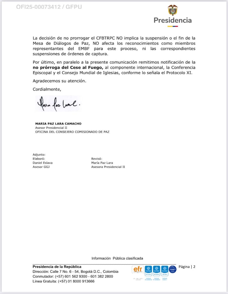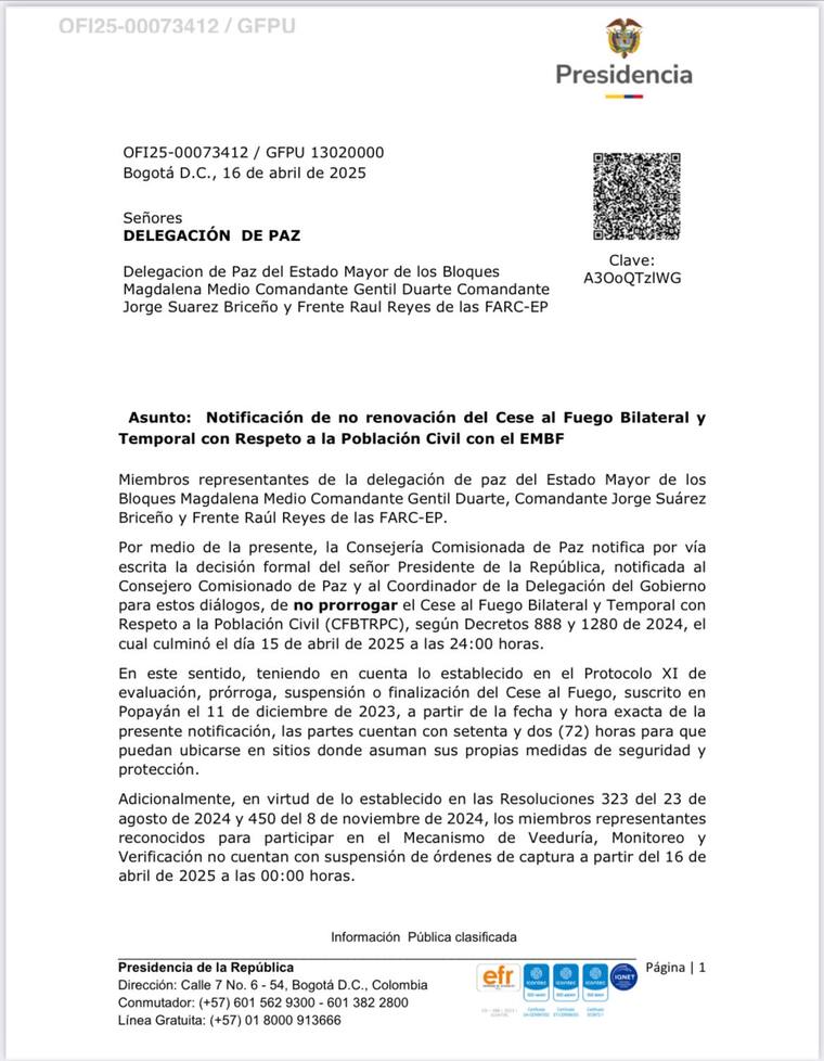 La Presidencia de la República, a través de la Consejería Comisionada de Paz, notificó de manera oficial que no se renovará el Cese al Fuego Bilateral y Temporal con Respeto a la Población Civil (CFBTRPC) que se había pactado con los Bloques Magdalena Medio, encabezados por alias Calarcá, en el marco de los diálogos con el Estado Mayor de las FARC-EP.