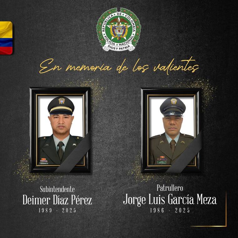 “¡𝗥𝗘𝗖𝗢𝗠𝗣𝗘𝗡𝗦𝗔 𝗗𝗘 𝗛𝗔𝗦𝗧𝗔 $ 𝟭𝟬𝟬 𝗠𝗜𝗟𝗟𝗢𝗡𝗘𝗦! Los atentados criminales perpetrados en Carepa y Chigorodó (Antioquia) contra nuestro subintendente Deimer Díaz Pérez y el patrullero Jorge Luis García Meza no quedarán en la impunidad. Con tal propósito creamos un equipo especial de investigación criminal y, en coordinación con la Gobernación de ese departamento, dispusimos una recompensa para quienes nos aporten información que permita dar con el paradero de los asesinos. Similar recompensa se ofrece para capturar a los responsables del crimen de nuestro patrullero de policía Andrés David Padilla Mejía, perpetrado en Lourdes (Norte de Santander)”, informó en su cuenta de X.