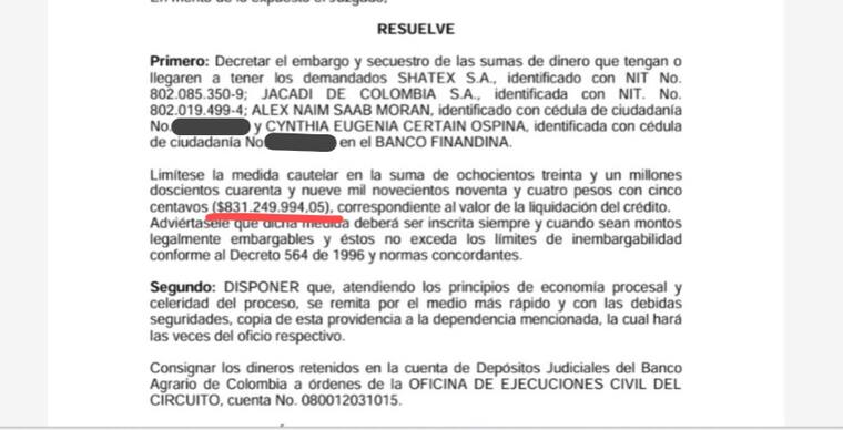 En ese sentido, el fallo señala que se debe “decretar el embargo y secuestro de las sumas de dinero que tengan o llegaren a tener los demandados Shatex, Jacadi de Colombia, Álex Naim Saab Moran y Cynthia Eugenia Certain Ospina”.