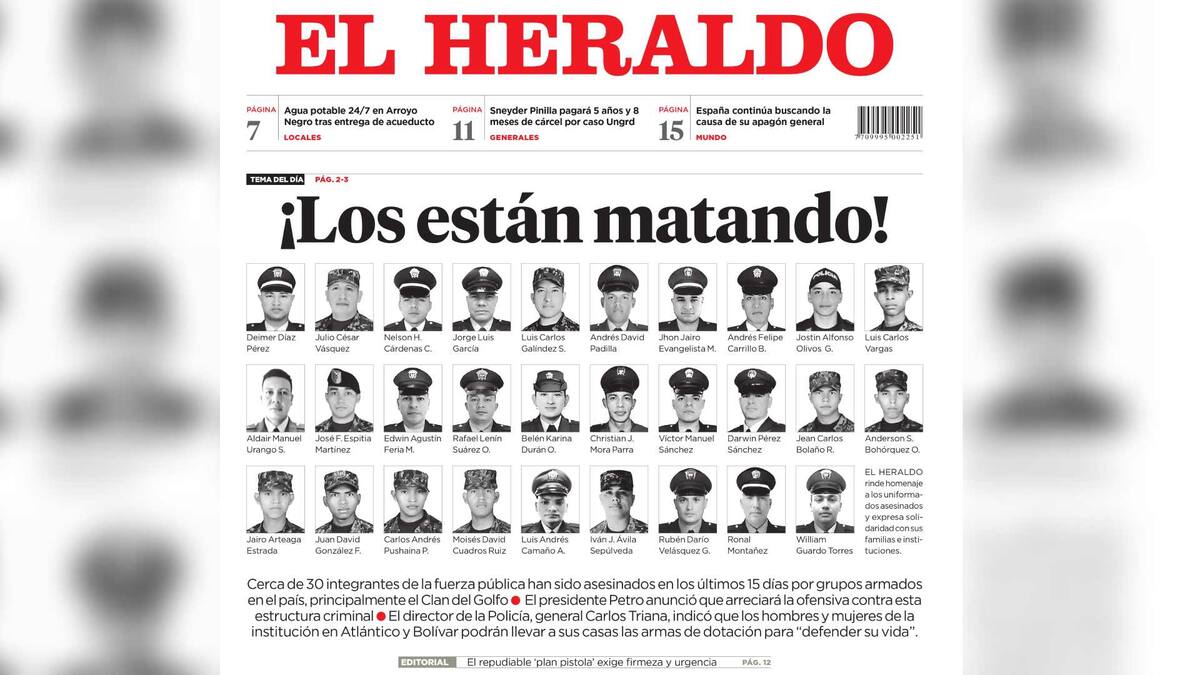 EL HERALDO, en su portada de este miércoles 30 de abril, rindió un homenaje a los 29 miembros de la fuerza pública que han sido vilmente asesinados por grupos armados ilegales, principalmente el Clan del Golfo, y expresó solidaridad con sus familias e instituciones.