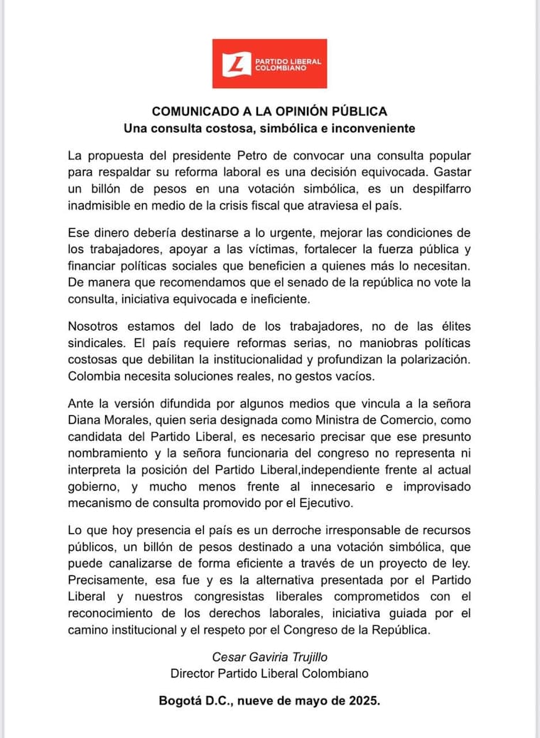 El director del Partido Liberal, César Gaviria Trujillo, instó este jueves al Senado de la República a no respaldar la convocatoria a una consulta popular planteada por el Gobierno Nacional para legitimar su proyecto de reforma laboral. A través de un comunicado público, el expresidente advirtió que se trataría de una medida improcedente y costosa en medio del actual contexto fiscal del país.