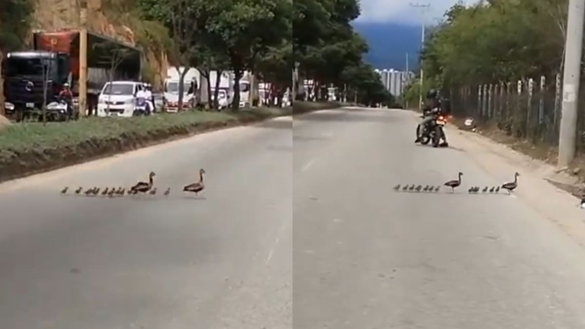 Según se puede ver en las imágenes, los dos patos adultos y sus trece crías intentaban cruzar el corredor, caracterizado por el tránsito constante de vehículos de carga, buses intermunicipales y automóviles particulares.