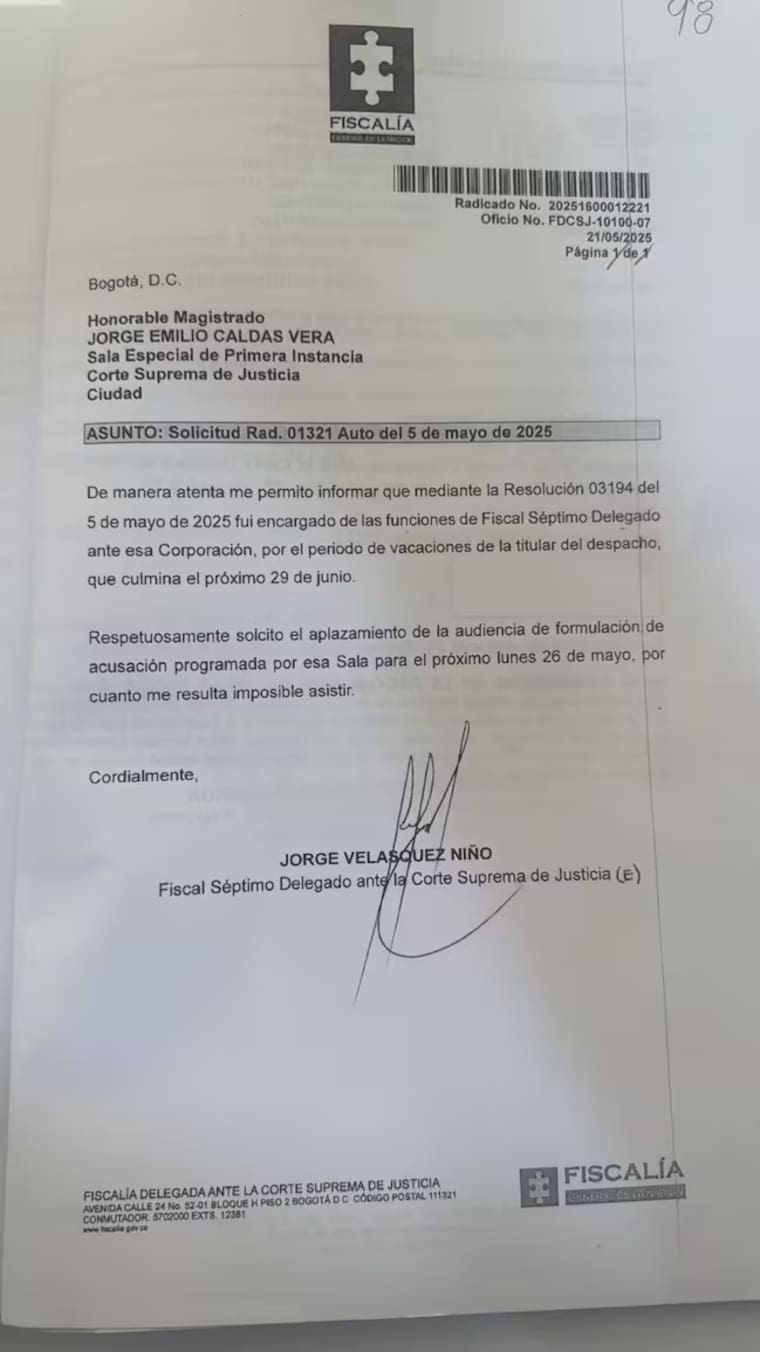 Pese a lo anterior, el despacho del magistrado Jorge Emilio Caldas, encargado del caso, consideró que la circunstancia no constituía un impedimento suficiente para reprogramar la diligencia y resolvió rechazar el aplazamiento.