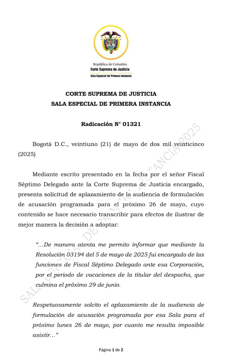 Según la comunicación oficial de la Corte, la audiencia deberá realizarse en la fecha prevista y será responsabilidad de la Fiscalía designar al funcionario que la asuma.