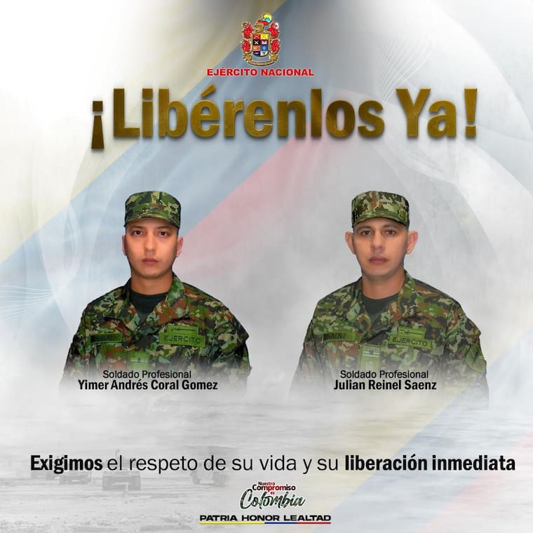 Los dos soldados secuestrados son Julián Reinel Sáenz y Yimer Andrés Coral ambos adscritos a la Segunda División del Ejército y quienes desde el pasado 9 de abril están bajo el poder del grupo armado luego de ser secuestrados mientras realizaban labores de vigilancia en el barrio Colinas del Tunal de Cúcuta.