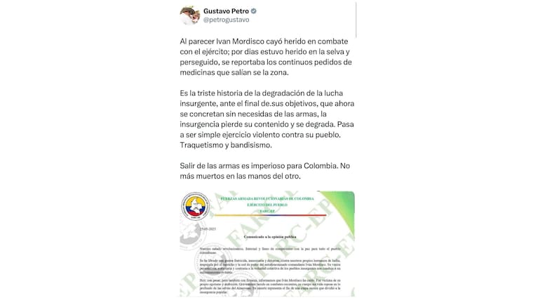 Asimismo, el primer mandatario señaló que la presunta muerte del jefe de las disidencias esa “la triste historia de la degradación de la lucha insurgente, ante el final de sus objetivos”.