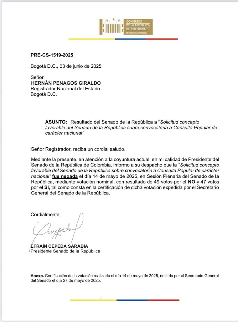 “Informo a su despacho que la “Solicitud concepto favorable del Senado de la República sobre convocatoria a Consulta Popular de carácter nacional” fue negada el día 14 de mayo de 2025, en Sesión Plenaria del Senado de la República, mediante votación nominal,con resultado de 49 votos por el NO y 47 votos por el SI, tal como consta en la certificación de dicha votación expedida por el Secretario General del Senado de la República”, detalla el documento.