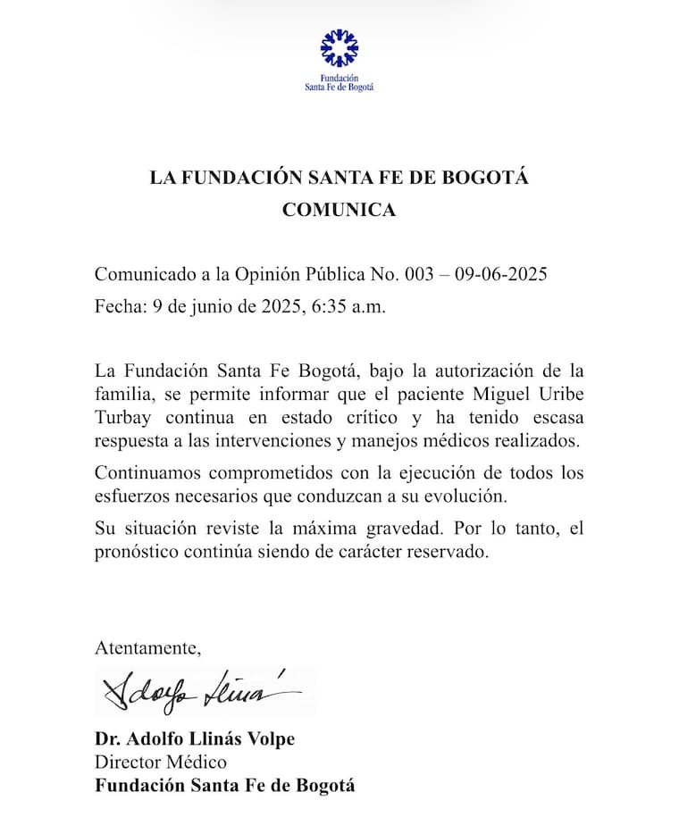 La Fundación Santa Fe de Bogotá emitió a las 6:35 de la mañana de este lunes 9 de junio un nuevo parte médico sobre la salud del senador del Centro Democrático y precandidato presidencial Miguel Uribe Turbay, quien fue víctima de un atentado a bala en la tarde del sábado 7 de junio en medio de un acto político en un parque de Modelia, barrio de la localidad de Fontibón, en el oeste de la capital del país.