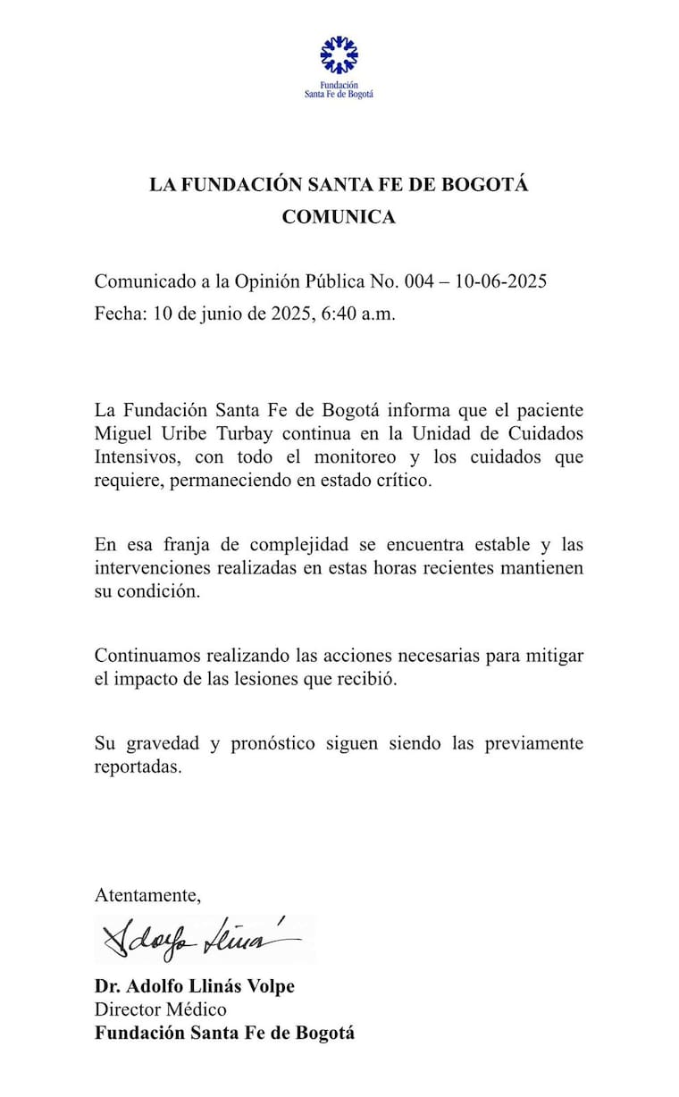 El centro médico informó que Miguel Uribe Turbay continúa en la Unidad de Cuidados Intensivos, con todo el monitoreo y los cuidados que requiere, pero su estado sigue siendo crítico.