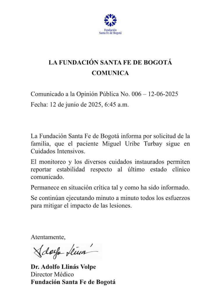 Agregó el centro médico que Uribe Turbay permanece en situación crítica, por lo que “se continúan ejecutando minuto a minuto todos los esfuerzos para mitigar el impacto de las lesiones”.