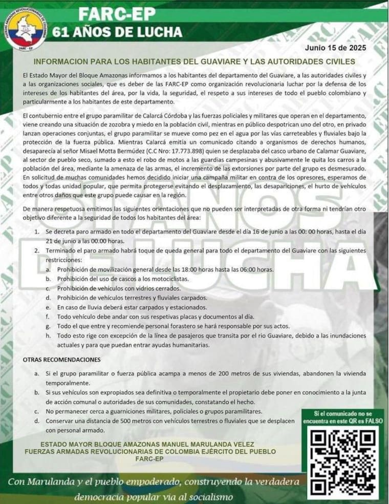 “Se decreta paro armado en todo el departamento del Guaviare desde el día 16 de junio a las 00:00 horas hasta el día 21 de junio a las 00:00 horas”, dice un comunicado difundido en redes sociales por esas disidencias.