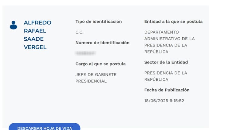 Sobre las 6:15 de la mañana de este miércoles 18 de junio fue publicada la hoja de vida de Alfredo Saade Vergel, una ficha muy cercana del petrismo, como nuevo jefe de gabinete del presidente Gustavo Petro.