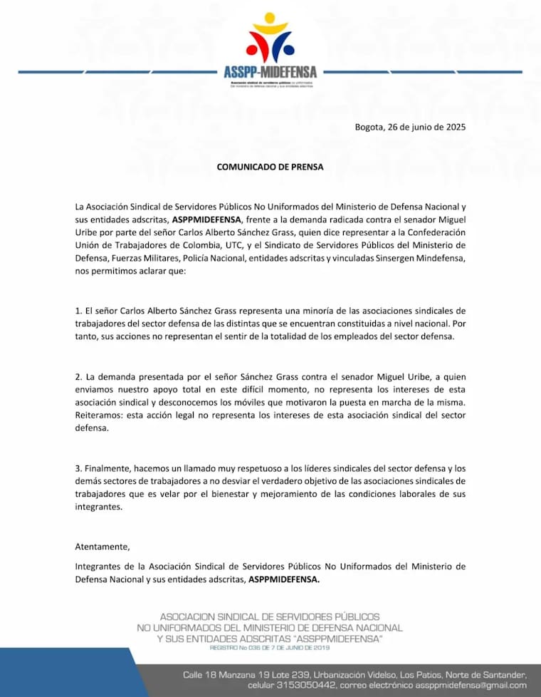 La asociación fue enfática en manifestar que “sus acciones no representan el sentir de la totalidad de los empleados del sector defensa” y que “la demanda presentada por el señor Sánchez Grass contra el senador Miguel Uribe [...] no representa los intereses de esta asociación sindical”.