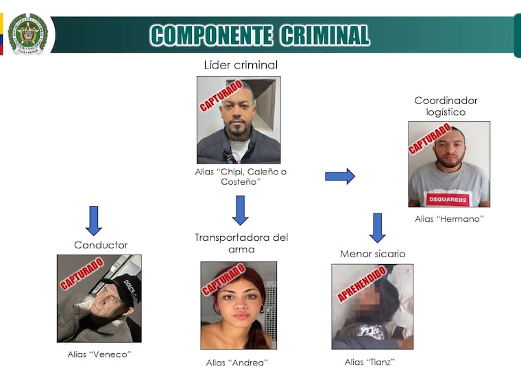 Por ahora han sido capturados cinco presuntos implicados en el atentado: además de El Costeño y Gabriela, están alias Hermano, el coordinador logístico; alias Veneco, el conductor del Spark gris del día de los hechos y alias Tianz, el menor sicario.