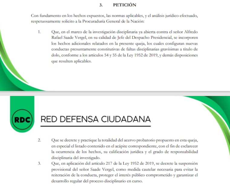 La querella fue presentada por el abogado Leinder Molina Miranda presentó ante la Procuraduría General de la Nación, entidad que ya había ordenado la apertura de una investigación disciplinaria en contra de Saade y los excancilleres Laura Sarabia y Luis Gilberto Murillo.