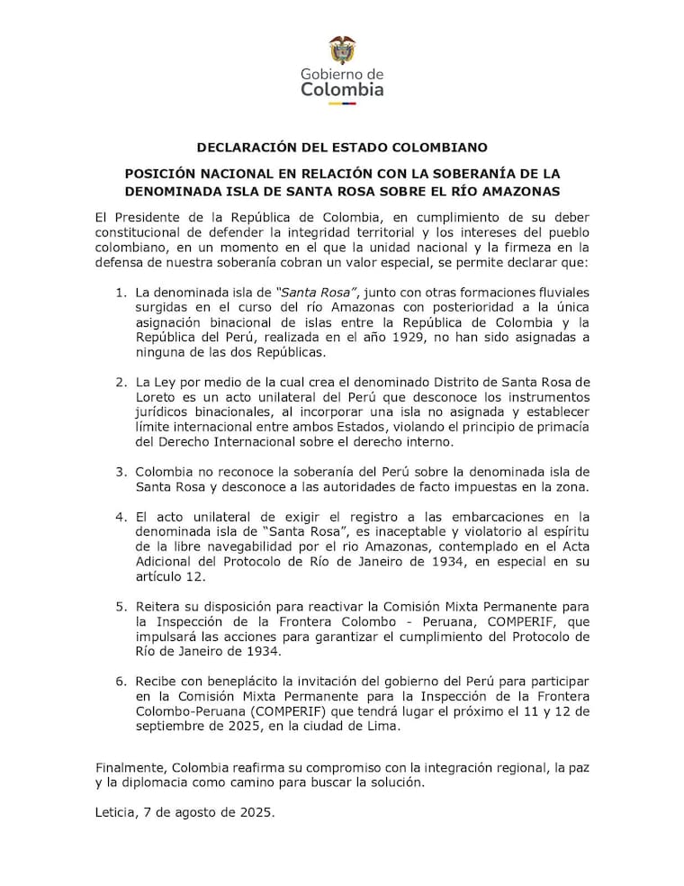 “Colombia no reconoce la soberanía del Perú sobre la denominada isla de Santa Rosa y desconoce a las autoridades de facto impuestas en la zona”, dijo Petro en Leticia, ubicada frente a Santa Rosa, donde agregó que la asignación de dicha isla y de otras surgidas en el río Amazonas después de 1929, debe discutirse en una comisión binacional y, en última instancia, en tribunales internacionales.