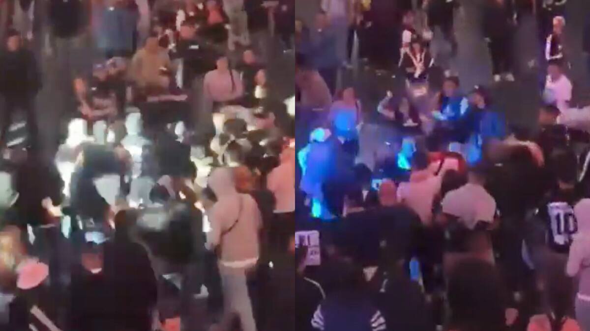 Al parecer, todo comenzó con un riña entre hinchas de equipos de fútbol y se convirtió rápidamente en una batalla campal en frente del Movistar Arena, lo que obligó a una unidad antidisturbios de la policía a intervenir.