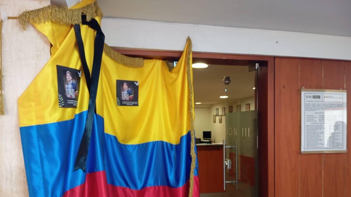Así mismo, en la entrada de la Comisión Tercera de la cámara alta, de la que hacía parte el parlamentario del Centro Democrático y que es una de las células legislativas económicas, que estudian asuntos de presupuesto e impuestos, permanece en la puerta extendida una bandera tricolor también con la imagen del congresista.
