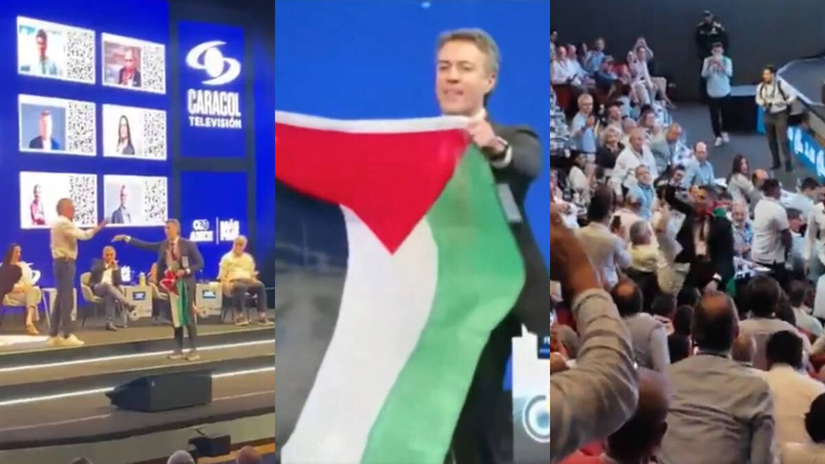 En medio del debate, Quintero, quien no se encontraba en la lista de invitados, según confirmó Bruce Mac Master, se subió al escenario y ondeó la bandera de Palestina.