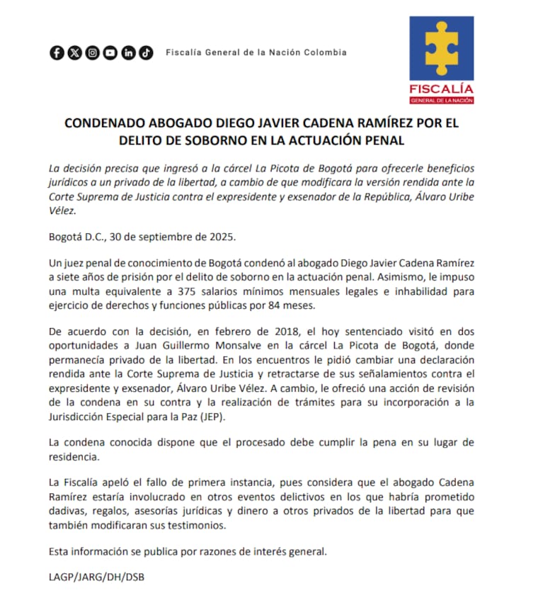 Este martes 30 de septiembre, el Juzgado Tercero de Conocimiento de Bogotá condenó a Diego Javier Cadena Ramírez, exabogado del expresidente Álvaro Uribe, a siete años de prisión domiciliaria, por el delito de de soborno en actuación penal, en el caso del exparamilitar Juan Guillermo Monsalve.