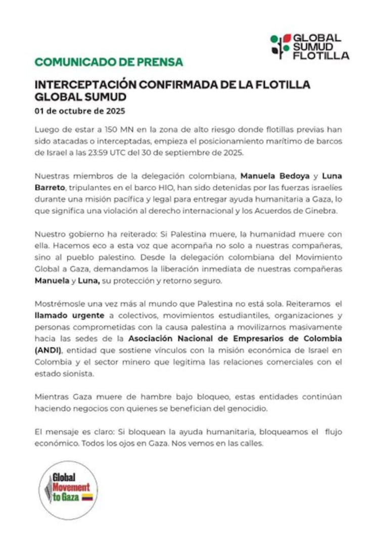 La delegación colombiana que acompañaba la Flotilla Global Sumud, que llevaba ayuda humanitaria a Gaza, denunció que fueron interceptados por Fuerzas Militares de Israel, a menos de 90 millas náuticas de su destino.