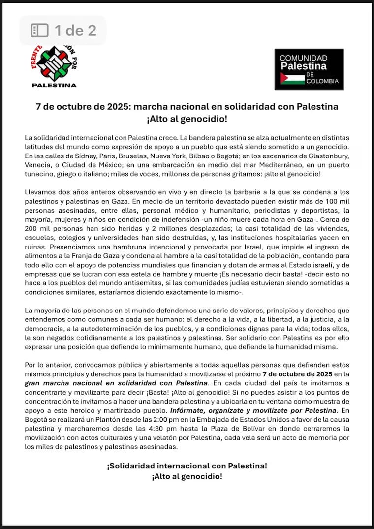 Diversas organizaciones sociales, entre ellas la Federación Colombiana de Educadores (Fecode), han convocado una jornada nacional de movilización en solidaridad con Palestina, prevista para este martes 7 de octubre en diferentes ciudades del país.