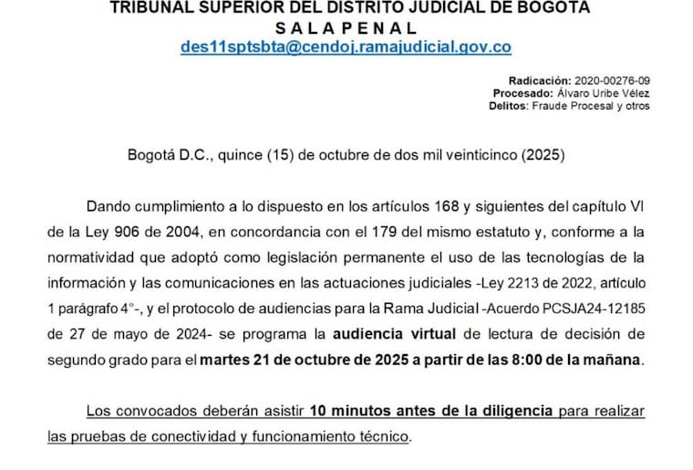 “Dando cumplimiento a lo dispuesto en auto del 15 de octubre de 2025, comedidamente se les solicita asistir de manera virtual a la audiencia de lectura de decisión de segundo grado, programada para el próximo martes 21 de octubre de 2025, a partir de las 8:00 de la mañana”, indicó a través de un comunicado el alto tribunal.