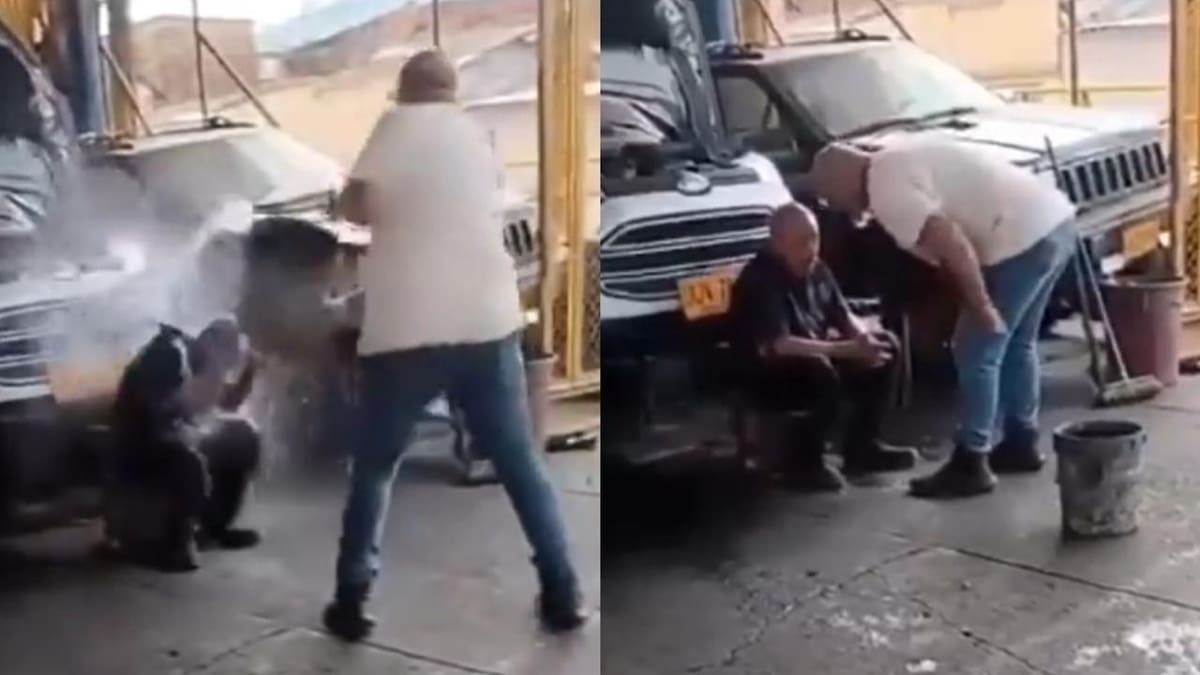 En el video se puede ver a un hombre, presuntamente el dueño del establecimiento, lanzándole un balde de agua a un adulto mayor que sería su empleado, mientras este permanece sentad en un pequeña silla